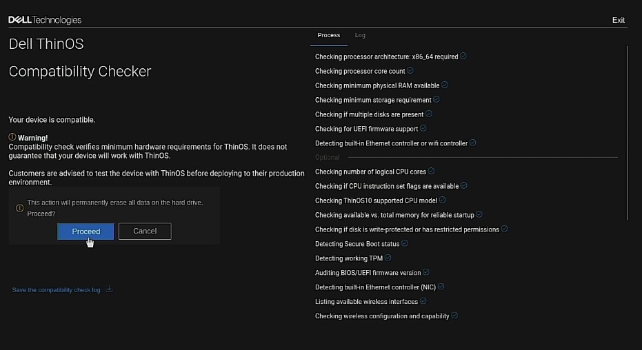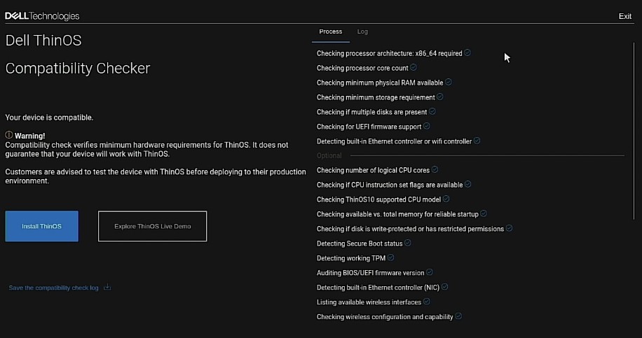 Once you boot from the USB key, the Dell ThinOS 10 Compatibly Checker will run checking for RAM, storage, etc..