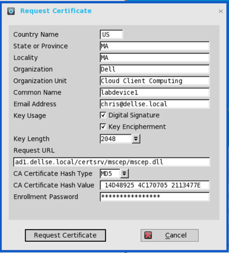 On Dell Wyse ThinOS go to System Tools\Certificates and select “Request Certificate” and the following screen will appear.