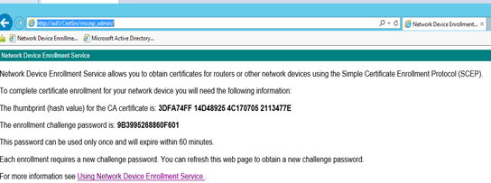 3. CA Certificate Hash Value: You will need to browse to the following location on your NDES server; http://hostname/certsrv/mscep/mscep.dll. You will then click link, http://hostname/certsrv/mscep_admin to get the Hash Value and Enrollment Password. * NOTE * Be sure to include spaces in the Hash Value name as it shows on the webpage example below.