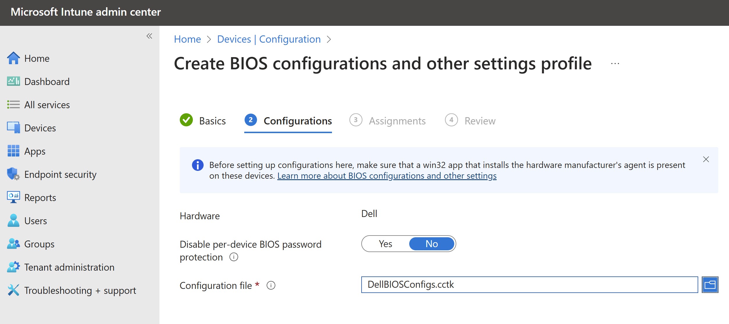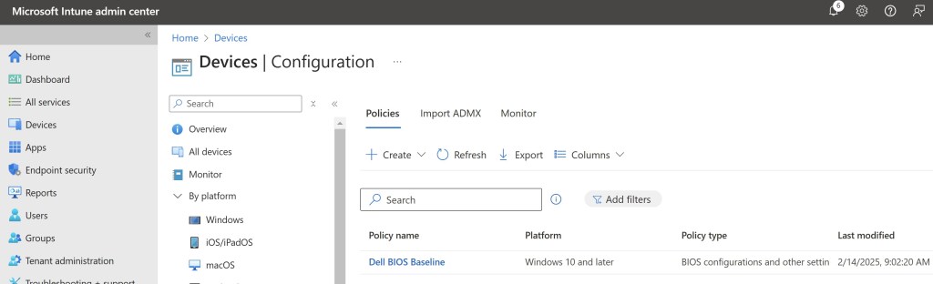 This allows you the ability to manage & deploy Dell client BIOS settings directly within your Intune portal. You basically deploy the Endpoint Configure application to the client, create a BIOS configuration package and upload that to Intune. Once configuration is in Intune, you can then create the device configuration policy to deploy out to the devices as needed.