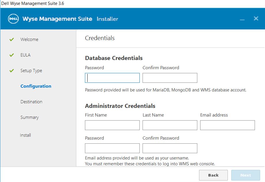 4. Provide credentials for both database access and administrator credentials. Note: The administrator credentials will be the login credentials you’ll use to log into the WMS console.