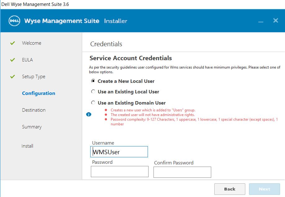 6. Select an option to create the WMS service account from the below options.