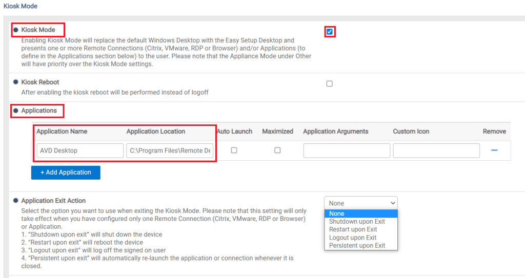 2. In the WES WMS configuration group, go to ‘Wyse EasySetup‘ and enable ‘Kiosk Mode‘. Under ‘Applications‘, section give the connection icon a name, i.e. AVD Desktop and under ‘Application Location‘, enter the path to the AVD client, i.e. C:\Program Files\Remote Desktop\msrdcw.exe